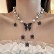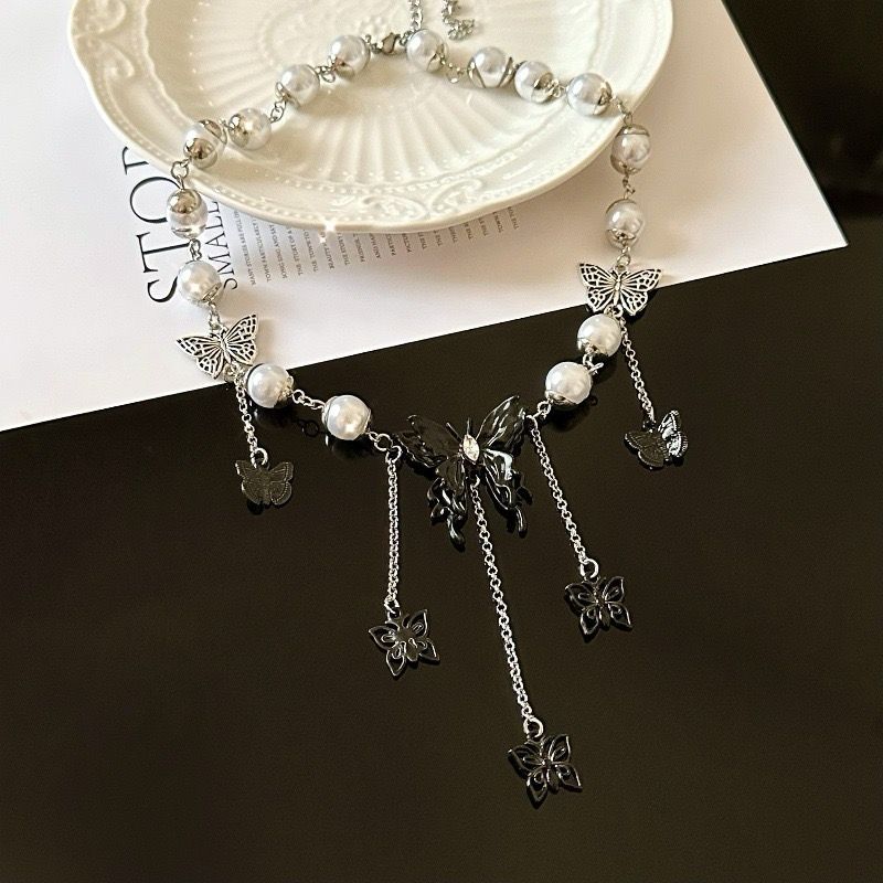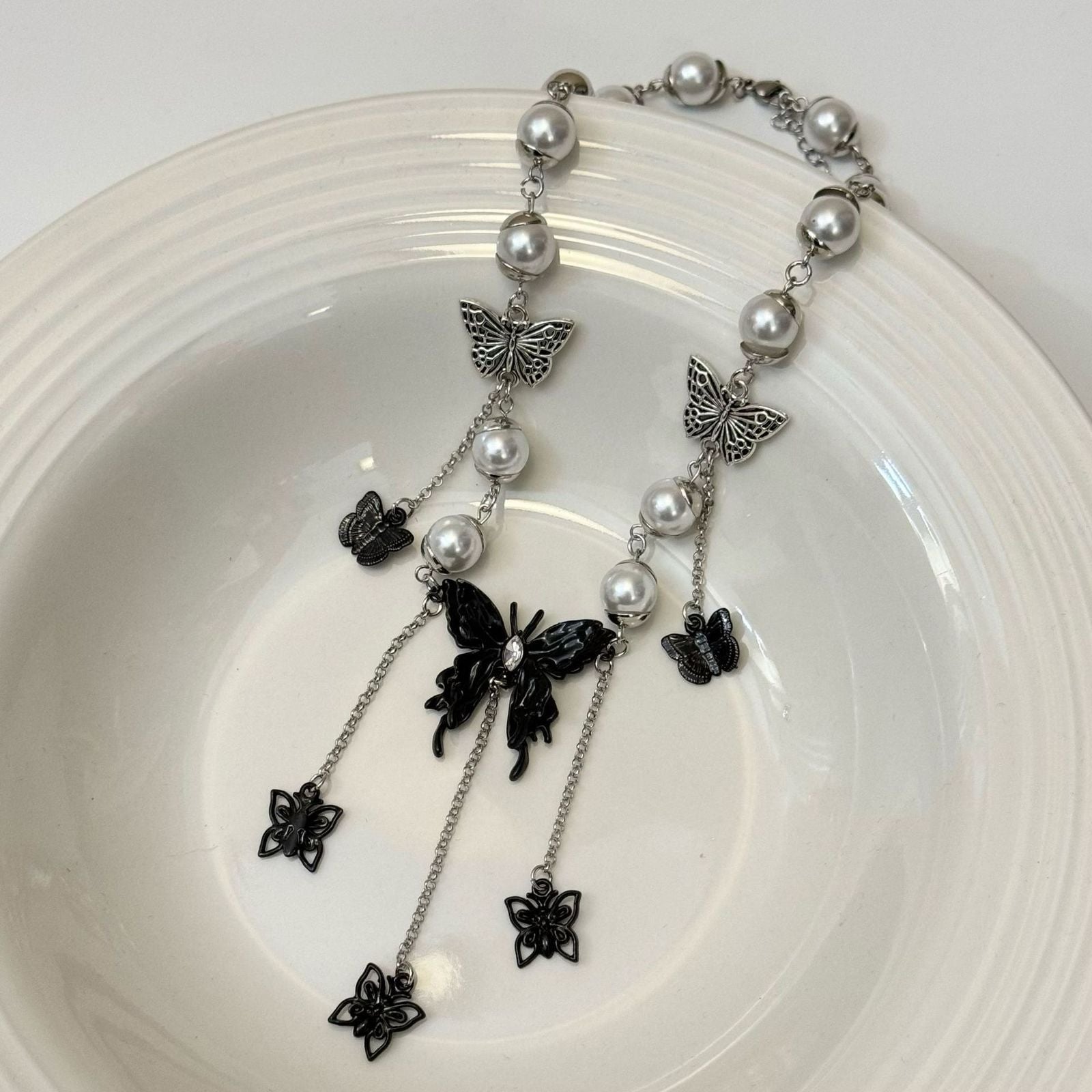 Pearl Necklace, Black Necklace, Silver Jewellery, Dreamy Necklace, Fairy Core Jewellery, Butterfly Necklace, Silver Necklace